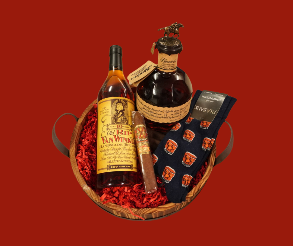 Savor in this gift basket of your dreams, including... - Old Rip Van Winkle 10 Year 107 Proof (750 mL): This is a remarkable whiskey for memorable occasions. It is mellow aged naturally in mountain oak through ten summers of their marvelous Kentucky sunshine. - Blanton's Original Single Barrel Bourbon (750 mL): First, Blanton’s label proclaims that it is “the original single barrel bourbon whiskey.” A deep, satisfying nose of nutmeg and spices. Powerful dry vanilla notes in harmony with hints of honey amid strong caramel and corn. A medium finish composed of returning corn and nutmeg flavors. - Fuente Fuente OpusX Destino Al Siglo: This cigar is the first ever Dominican Puro, made with a glorious wrapper tobacco cultivated in the mineral-rich soils of the Dominican Republic. The OpusX blend is regarded by many as the pinnacle of cigar perfection. - Jos A. Bank Mid-Calf Combed Cotton Socks: Your favorite drink on the rocks, a comfy chair, and a new pair of Made To Matter socks to complete your evening! These socks are made with natural weave to promote airflow and movement, soft combed cotton, spandex throughout for superior fit and comfort, and reinforced heal and toe.