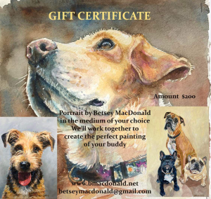 Betsy is Karen's cousin who does customized dog portraits in various media. A wonderful opportunity to capture your pets essence. $5,100 pesos value