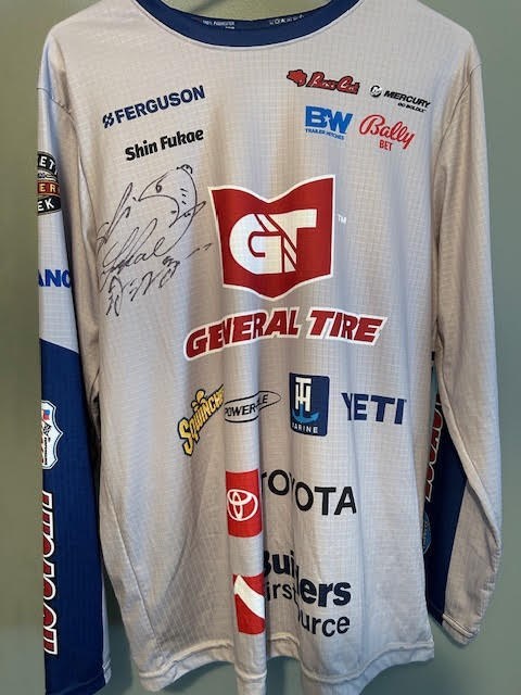 MLF AND BASS PRO TOUR ANGLER SHIN FUKAE AUTOGRAPHED GENERAL TIRE TEAM SERIES JERSEY.