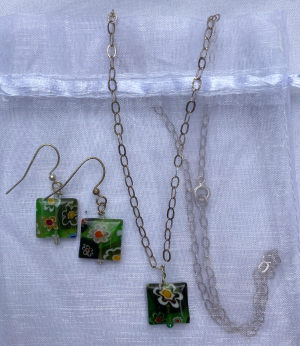 These earrings and necklace are made from Murano glass from Italy, with a delicate sterling silver chain. Donated by Jill and Link who were long term residents of San Pancho, currently living in Oaxaca. $300 pesos value