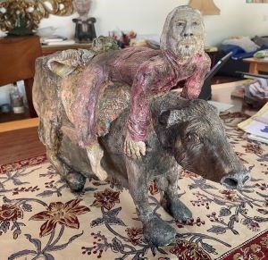 This piece was created by the internationally-renowned figurative ceramic artist, Carol Holtzman-Fregoso. She has lived part time for 30 years in San Pancho and resides the rest of the year in Sebastopol, CA. Carol also offers sculptural hand building classes in San Pancho. This piece reflects her interest in the cross between everyday day life and the spiritual. $30,600 pesos value