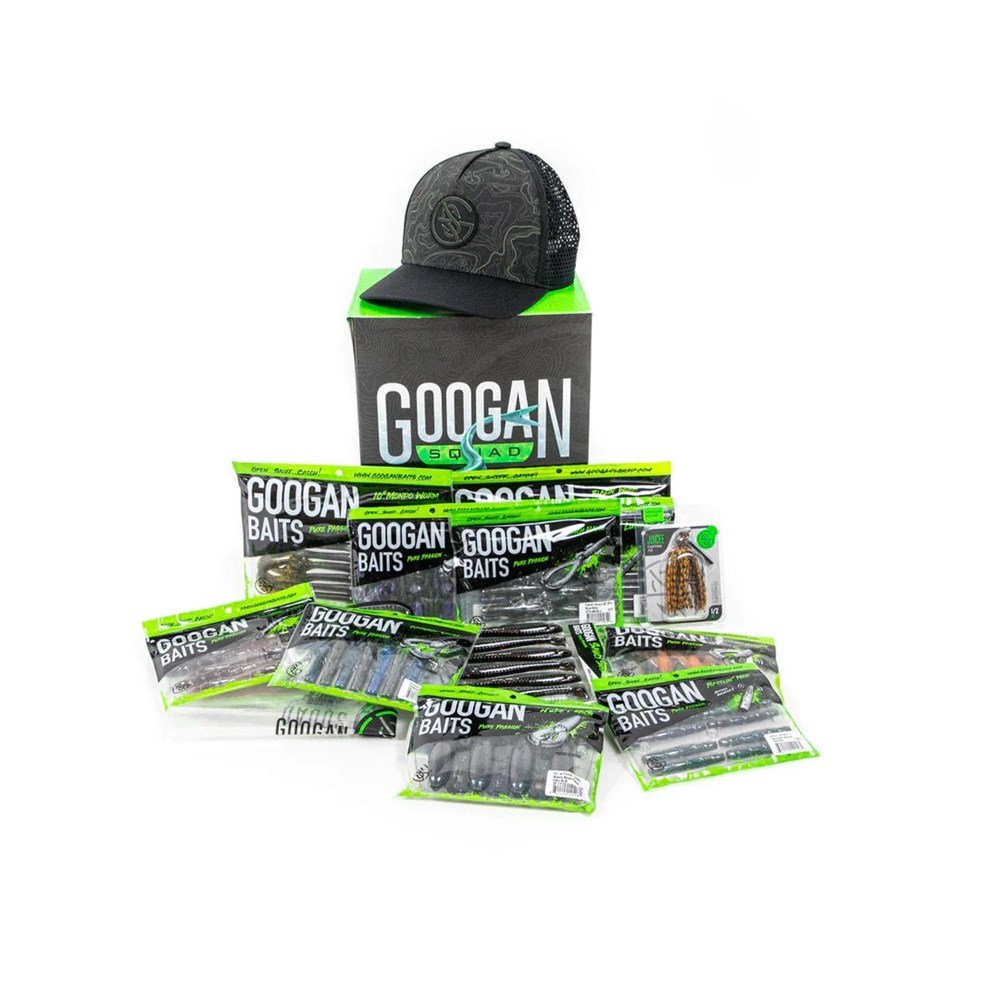BEST SELLERS MONEY BAG BUNDLE CONTAINS: • Bandito Bug • Drag N Drop • Krackin' Craw • Lunker Log 5" • Blazin Worm • Mondo Worm • Rattlin' Ned • Nuke Punch • Trench Hawg Jr • Saucy Swimmer 4.8" • Rattlin' Chunk • Juicee Jig 5/16oz • Googan Money Bag • Midnight Topo Klutch Snapback