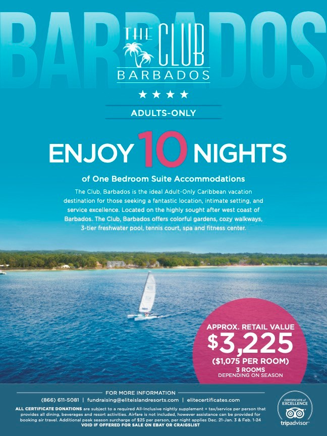 THE CLUB BARBADOS RESORT & SPA ADULTS ONLY 10 nights of One Bedroom Suite accommodation, for three rooms double occupancy Nightly All-Inclusive Supplement Required https://www.theclubbarbados.com/ RESORT INFORMATION/NIGHTLY SUPPLEMENT THE CLUB BARBADOS RESORT & SPA ADULTS-ONLY $150 per person/per night (based on double occupancy + tax/service) The Club Barbados, located on the prestigious platinum west coast of the island offers guests an adults only experience. There is plenty to enjoy with spacious accommodations, three freshwater swimming pools, water sports, two dining options, tennis, fitness center, spa, piano bar & lounges. The Club exudes intimacy with its romantic oceanfront setting, tropical gardens, cozy walkways, and friendly social atmosphere. This Resort Certificate provides 10 nights accommodation (double occupancy) for 3 rooms (valued up to $1,075 per room depending on dates of travel) at The Club Barbados. All reservations are subject to a required supplement of $150 per person/per night which provides all dining, all beverages (including alcohol), resort facilities & activities. Government tax/service is additional. Guests choosing to upgrade to a higher room category may do so for as little as $56 per night + tax. Air transportation is not included. Should you require air we are available to assist. Resort black-out dates do not apply however, minimum 7 night stay and additional peak season surcharge of $25 per person, per night applies Dec. 21-Jan. 3 & Feb. 1-24. Air must be purchased at the time of booking for stays Dec. 21-Jan. 3 & Feb. 1-24. Reservations are subject to availability, some restrictions apply. Expiration date is a “Book By” date not a “Travel By” date. Rates are subject to annual increases and the resort cancellation policies in effect at the time of reservation. BONUS INVITATION: As a holder of this Certificate you also receive an extra Certificate stay to 5-star Los Establos Boutique Resort, Panama. Expiration Date: 12-20-25