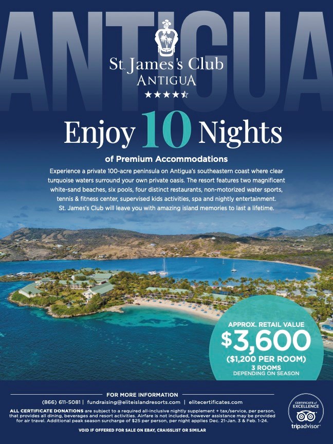 ST. JAMES’S CLUB & VILLAS 10 nights of Premium accommodation, for three rooms double occupancy Nightly All-Inclusive Supplement Required https://www.stjamesclubantigua.com/ RESORT INFORMATION/NIGHTLY SUPPLEMENT ST. JAMES’S CLUB & VILLAS, ANTIGUA $150 per person/per night (based on double occupancy + tax/service) Experience a private 100-acre peninsula on Antigua’s southeastern coast where clear turquoise waters surround your own private oasis. Two magnificent white- sand beaches, six pools, four distinct restaurants, non-motorized water sports, tennis & fitness center, supervised kids activities, spa and nightly entertainment. St. James’s Club will leave you with amazing island memories to last a lifetime. This Resort Certificate provides 10 nights accommodation (double occupancy) for 3 rooms (valued up to $1,200 per room depending on dates of travel) at St. James’s Club & Villas. All reservations are subject to a required supplement of $150 per person/per night which provides all dining, all beverages (including alcohol), resort facilities & activities. Government tax/service is additional. Guest choosing to upgrade to higher category may do so for as little as $60 per night + tax. Air transportation is not included. Should you require air we are available to assist. Resort black-out dates do not apply however, minimum 7 night stay and additional peak season surcharge of $25 per person, per night applies Dec. 21-Jan. 3 & Feb. 1-24. Air must be purchased at the time of booking for stays Dec. 21-Jan. 3 & Feb. 1-24. Reservations are subject to availability, some restrictions apply. Expiration date is a “Book By” date not a “Travel By” date. Rates are subject to annual increases and the resort cancellation policies in effect at the time of reservation. BONUS INVITATION: As a holder of this Certificate you also receive an extra Certificate stay to 5-star Los Establos Boutique Resort, Panama. Expiration Date 12-20-25