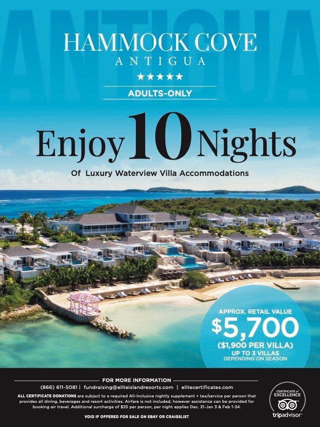 HAMMOCK COVE ANTIGUA ADULTS-ONLY 10 nights of Luxury Waterview Villa accommodation, for up to two villas double occupancy Nightly All-Inclusive Supplement Required https://www.hammockcoveantigua.com/ RESORT INFORMATION/NIGHTLY SUPPLEMENT HAMMOCK COVE ANTIGUA • ADULTS-ONLY $306-323 per person/per night depending on dates of travel (based on double occupancy + tax/service) Located adjacent to Devil’s Bridge National Park, this intimate villa resort provides a truly indulgent and customizable holiday for discerning travelers. All 41 private single-story villas are equipped with king beds, “infinity edge” plunge pool, spacious private terrace overlooking stunning turquoise waters, gourmet dining, and personal cocktail lounge. This Certificate provides 10 nights accommodation for up to 3 Waterview Villas (double occupancy) (valued up to $1,900 per room depending on dates of travel). All reservations are subject to mandatory supplement of $306-323 per person/per night depending on dates of travel that provides dining, beverages (including alcohol), resort facilities & activities. Government tax/service is additional. Guests choosing to upgrade to a Waterfront Villa category may do so for $200 per villa, per night. Resort black-outs do not apply however, minimum 7 night stay and additional peak season surcharge of $25 per person, per night applies Dec. 21-Jan. 3 & Feb. 1-24. Air transportation is not included Air transportation must be purchased prior to final confirmation of stays Dec. 21-Jan. 3 & Feb. 1-24. Reservations are subject to availability, some restrictions apply. Expiration date is a “Book By” date not a “Travel By” date. Rates are subject to annual increases and the resort cancellation policies in effect at the time of reservation. BONUS INVITATION: As a holder of this Certificate you also receive an extra Certificate stay to 5-star Los Establos Boutique Inn, Boquete, Panama. Expiration Date 12/20/25