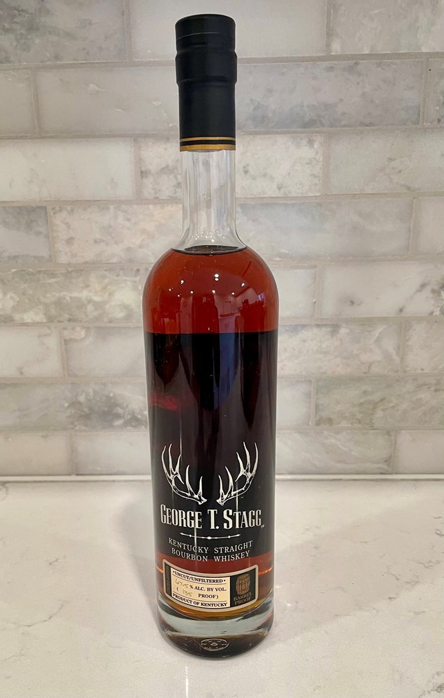 George T. Stagg Bourbon Lush toffee sweetness and dark chocolate with hints of vanilla, fudge, nougat and molasses. Underlying notes of dates, tobacco, dark berries, spearmint and a hint of coffee round out the palate.