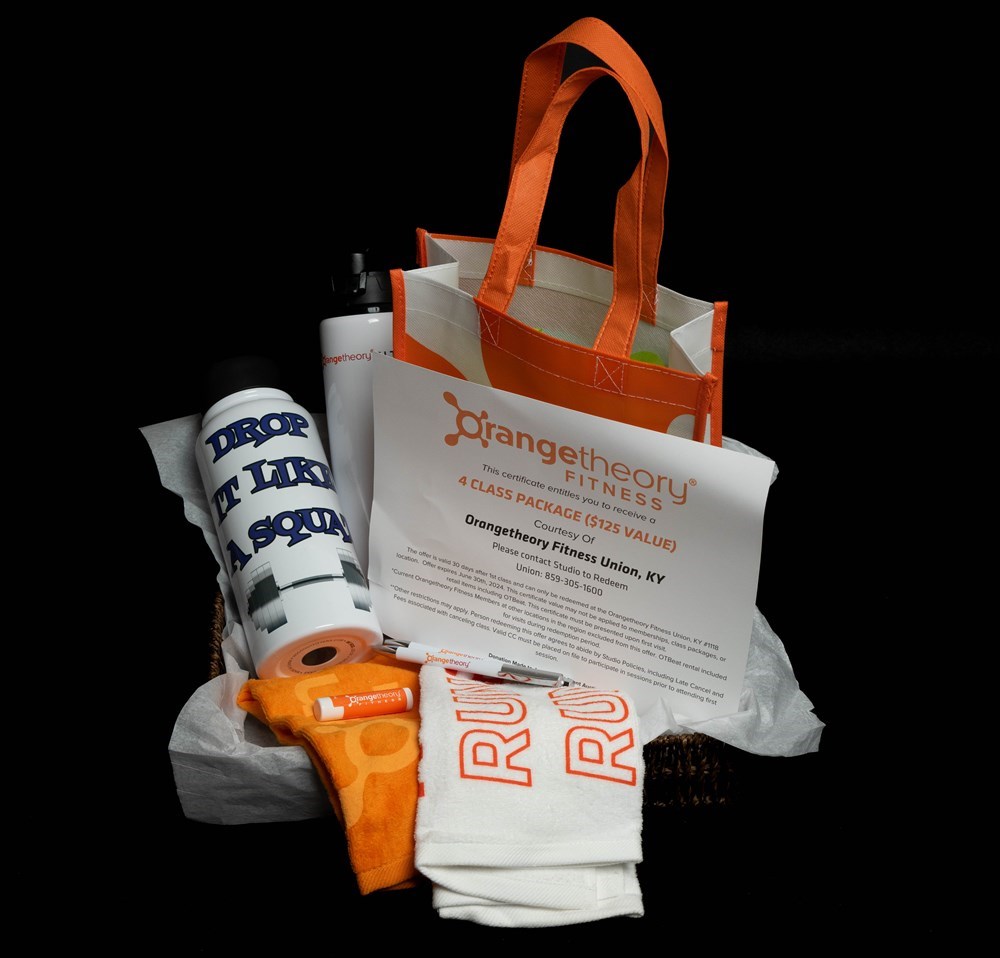 This basket contains: 1 - Orange Theory 4 class package 1 - Orange Theory water bottle 1 - ‘Drop it Like a Squat’ water bottle 2 - Orange Theory towels 2 - pens 1 - chapstick