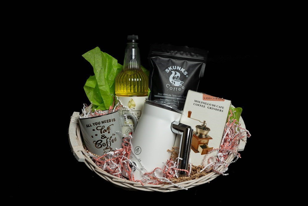This basket includes: 1 - Pampered Chef Milk Frother 1 - Hand-crank coffee grinder 1 - 10 oz bag of Skunk coffee beans 1 - Simply Barista Vanilla flavored syrup 1 - coffee cup