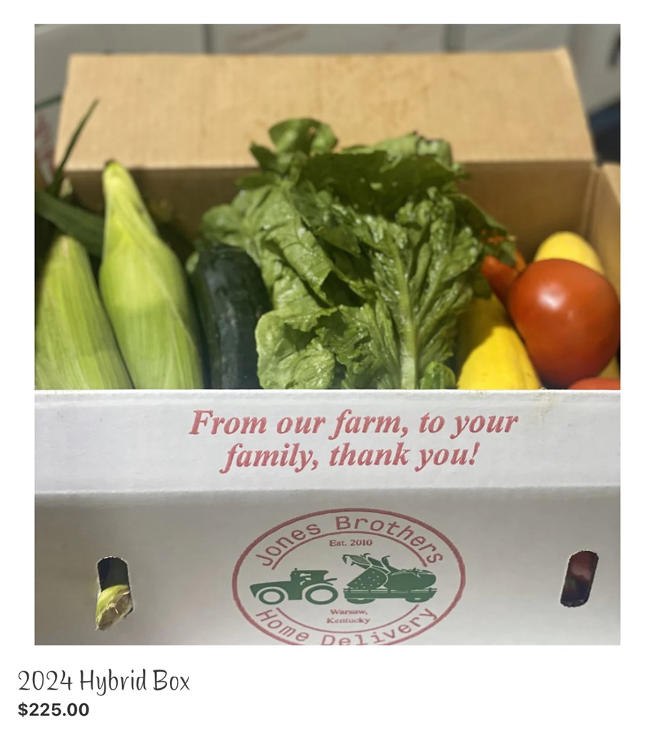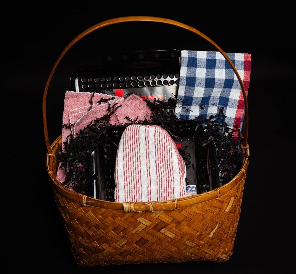This basket contains: 1 - 10 week 2024 Hybrid Box Subscription to Jones Brothers Farm (farm fresh fruits and vegetables delivered to your door - $225 value) 2 - Grilling baskets 2 - dish towels 1 - oven mitt