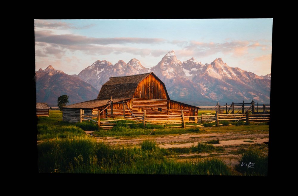 This basket contains: A professionally mounted professional 20x30 photograph on canvas by Mark Rector: John Moulton’s Barn Mormon Row with the Grand Tetons in Jackson Hole Wyoming.