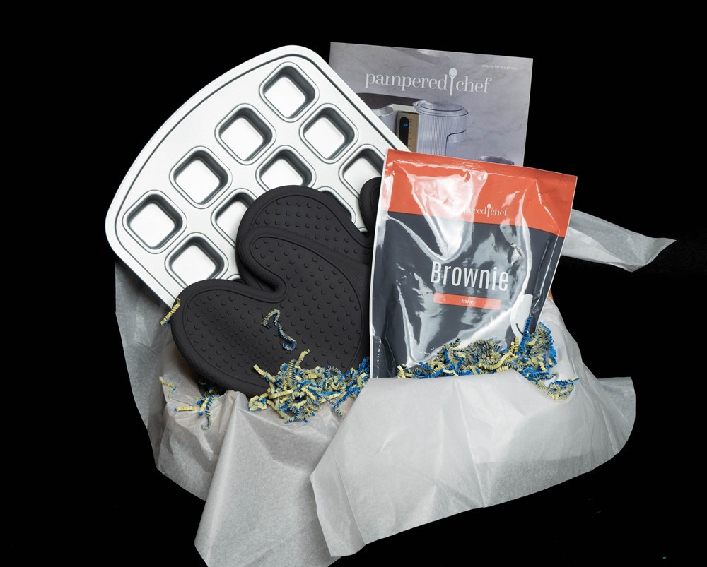 This basket contains: 1 - Pampered Cheff Browie Bite Pie 2 - Pampered Chef Silicone Oven Mitts 1 - Pampered Chef Brownie Mix