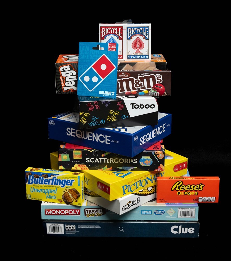 This game basket contains: 1 - $15 Domino’s gift card 1 - Clue board game 1 - Monopoly Travel World Tour 1 - Trouble 1 - Pictionary 1 - Scattergories 1 - Sequence Classic 1 - Taboo 1 - Jenga 2 - Decks of Bicycle playing cards