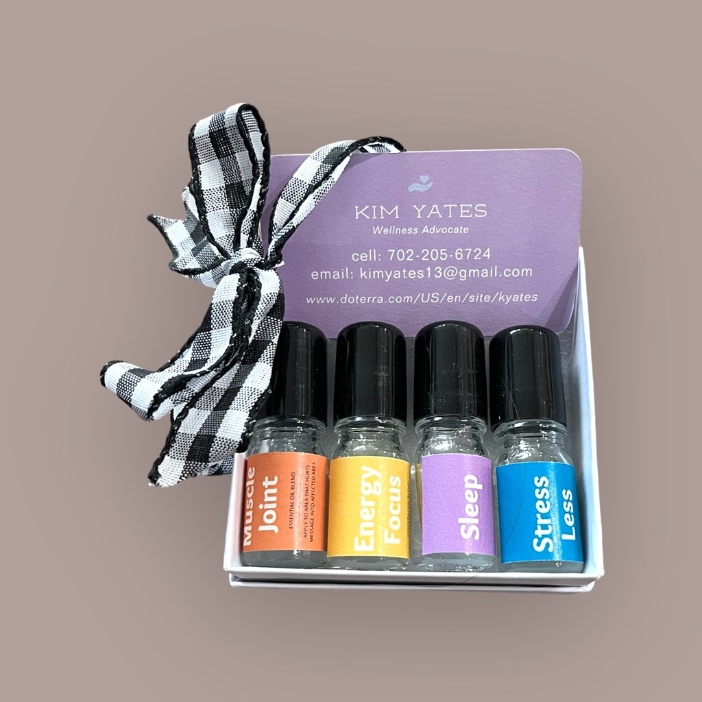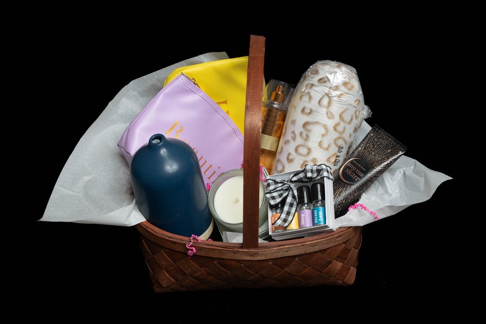 This basket contains: 4 - DoTerra rollers - Muscle Joint, Energy Focus, Sleep and Stress Less 5 - 16 pack Colorstreet 100% Real Nail Polish Strips 1 - Amorma Therapy diffuser 1 - Sage Leaf Candle 1 - Bath and BodyWorks Into The Night Body Cream 1 - Bath and BodyWorks Golden Sunflower Fine Fragrance Mist 2 - Make-up bags 1 - Lap size leopard fuzzy blanket