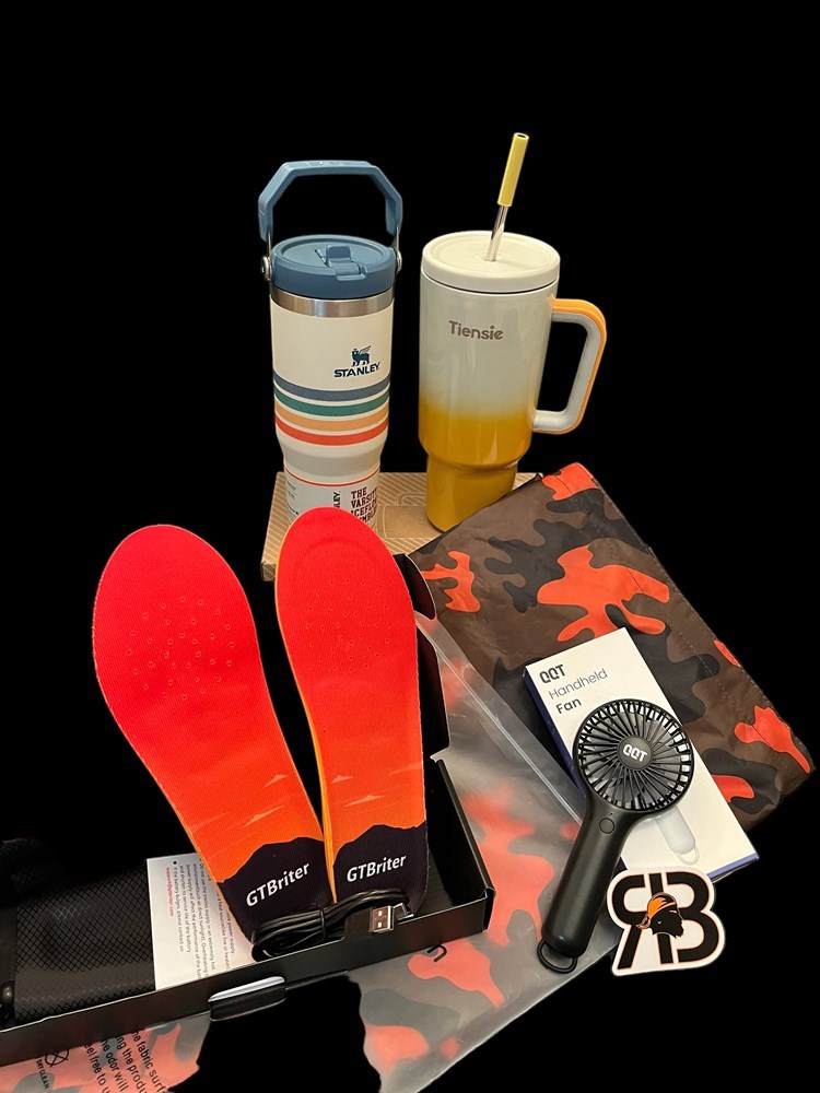 This basket includes: 2 - Luxury Stadium seats 1 - 30 oz Stanley Varisty Iceflow Tumbler 1 - 40 oz Tiensie tumbler (Better than Stanley!) 1 - Koceiiho rain poncho 1 - Hand-held fan 1 - Pair heated insoles