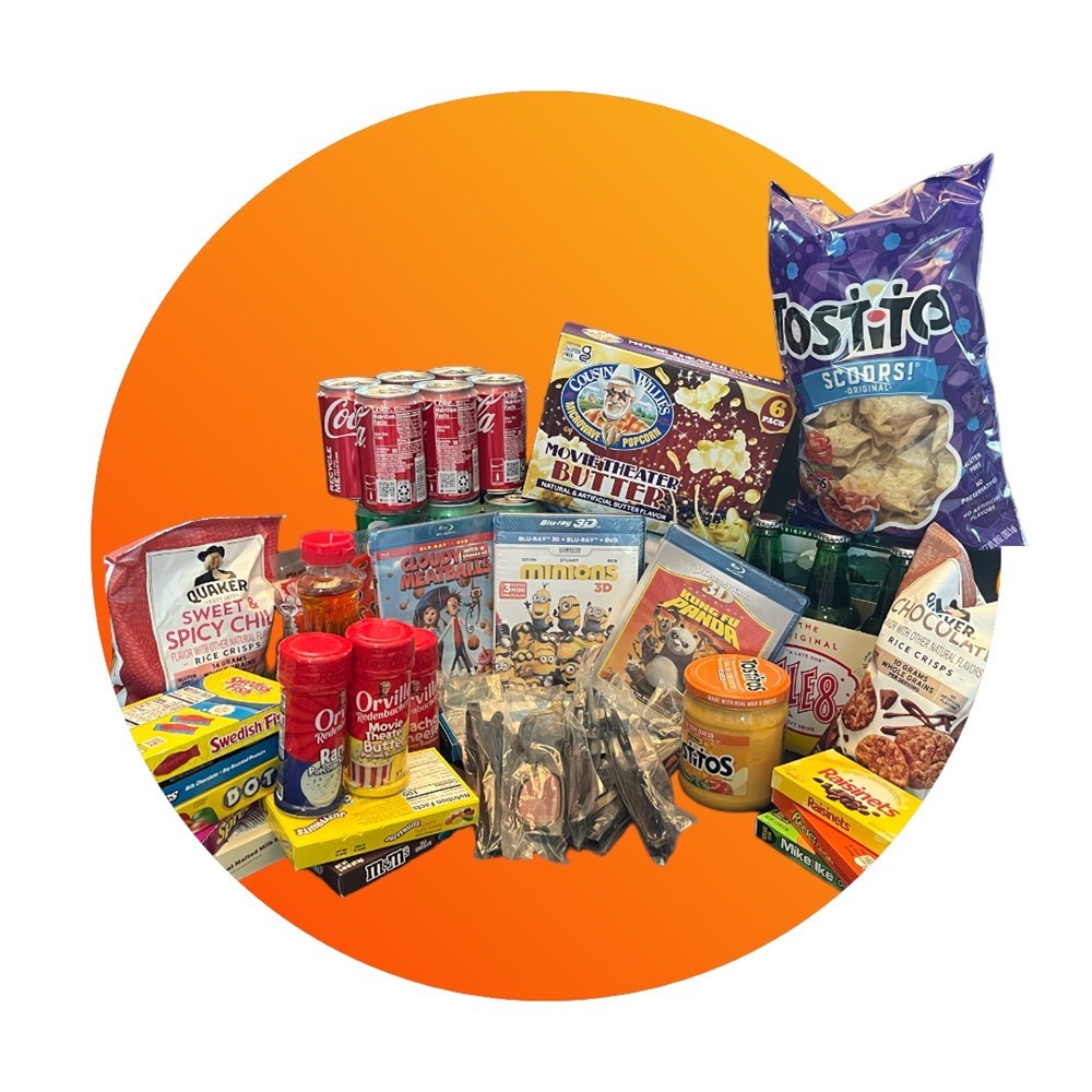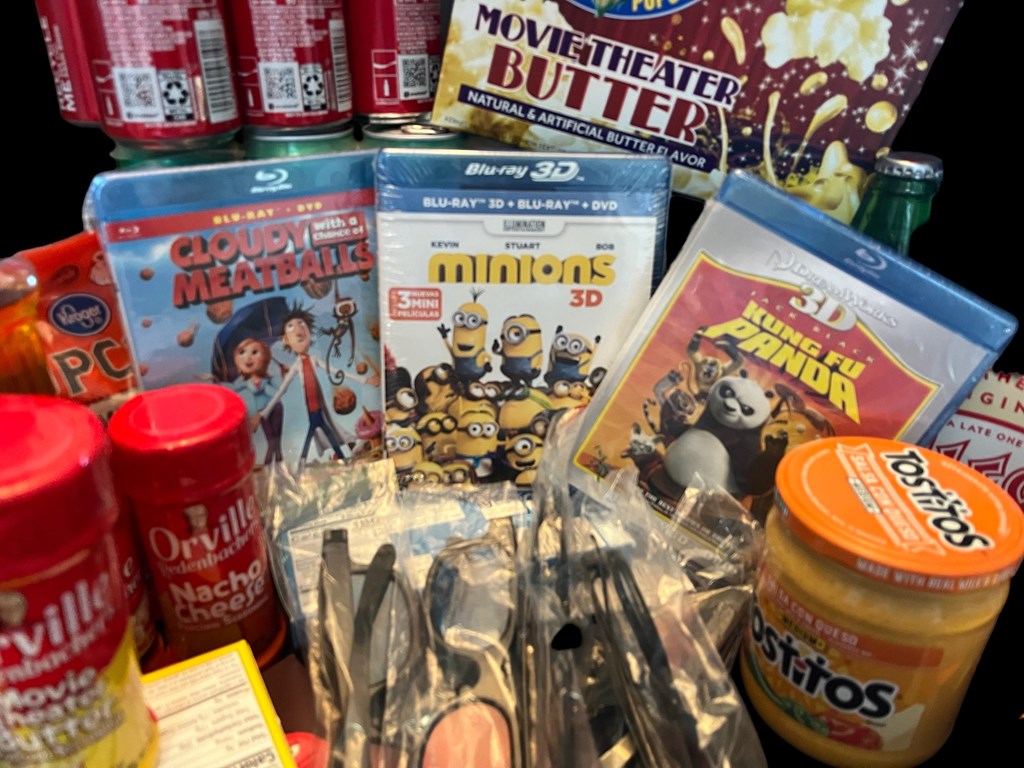 This basket contains: 3 - 3D BlueRay DVDs with 3D glasses: Cloudy with a Chance of Meatballs, Minons and Kung Fu Panda 6-pack Ale-8, 6 pack mini Sprite, 6 pack mini Fanta, 6 pack mini Coca-Cola Popcorn kernels, popcorn oil, three popcorn seasonings, microwave popcorn Trail mix Tostito’s Chips & nacho cheese dip Candy…lots of candy!