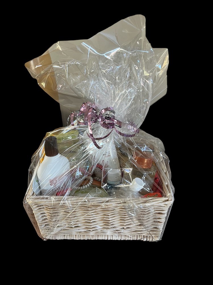 This basket contains: 2 - 13.5oz Bain de Terre Shampoo 1 - 13.5 oz Bain de Terre Conditioner 1 - 18oz Tree Hut Rainbow Sherbet Shea Sugar Scrub 1 - Tree Hut Vanilla Foaming Gel Wash 1 - 2.25 fl oz Hempz Vanilla Moisturizer 1 - 20z Aquage Texturizing Precision Flexible Wax 1 - Frosted Sugar Cookie Candle 1 - Spiced Maple Candle Hair ties Candy