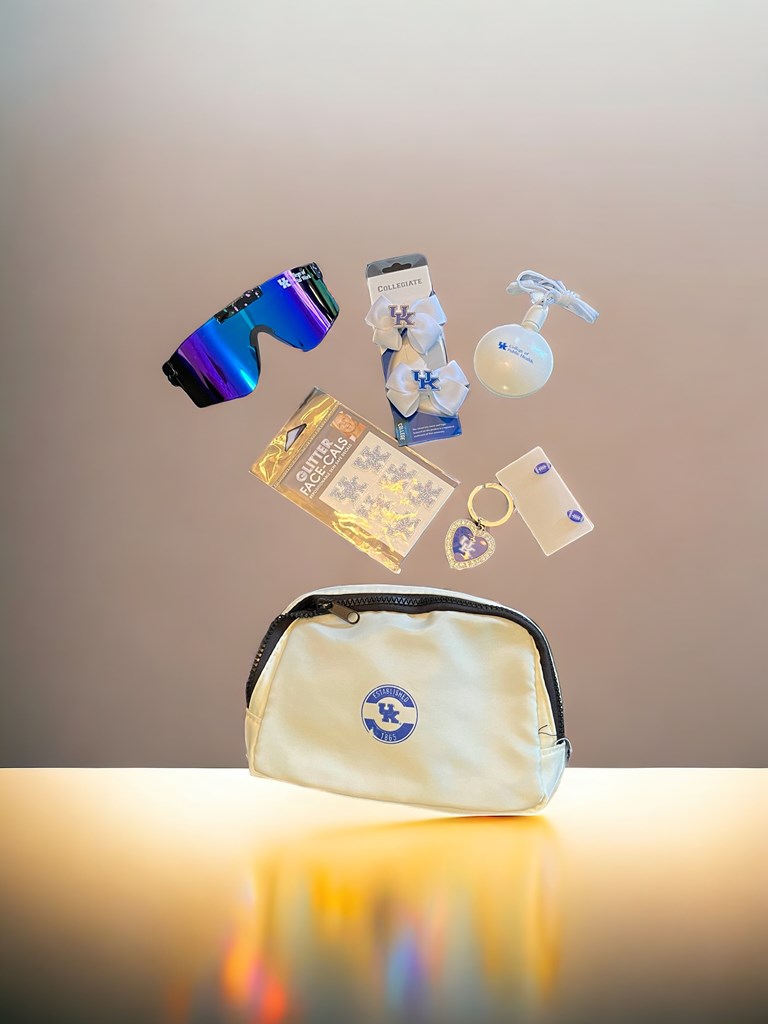 This basket contains: 1 - Authentic UK baseball sleeveless jersey 1 - Men’s Nike UK full zip jacket, medium 1 - Women’s Mike full zip jacket, small 1 - UK reusable shopping bag 1 - UK yard flag 1 - UK fanny pack 1 - Pair blue football earrings